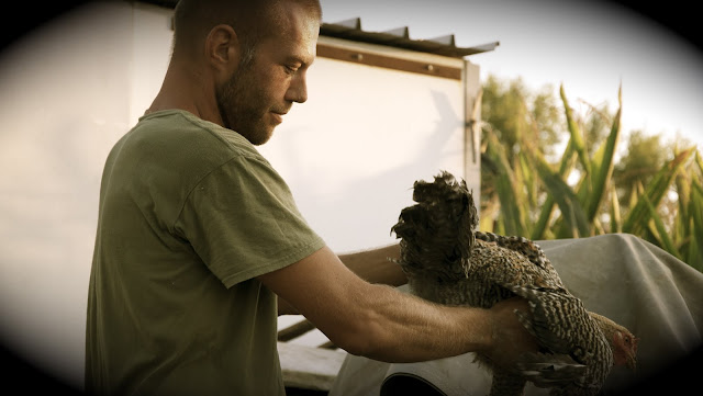 Galline impazzite, noncuranti della sua presenza continuano il loro vai e vieni nel salotto rurale, scombinato e malconcio. Ricordano una sala d’aspetto affollata d’altri tempi. Equilibri incerti e coriandoli di piume danno vita a una festa senza invito.